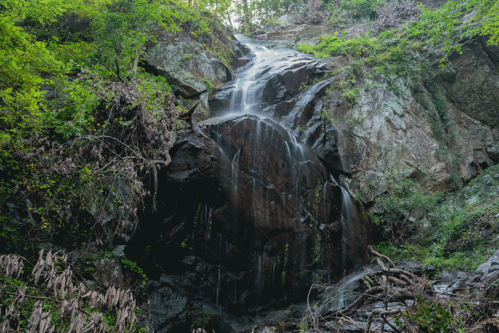 This is the top portion of the two-tier waterfall. The bottom portion is obscured by downfall. This waterfall is best seen after a period of heavy rain. It is accessed by boat on Lake Jocassee.