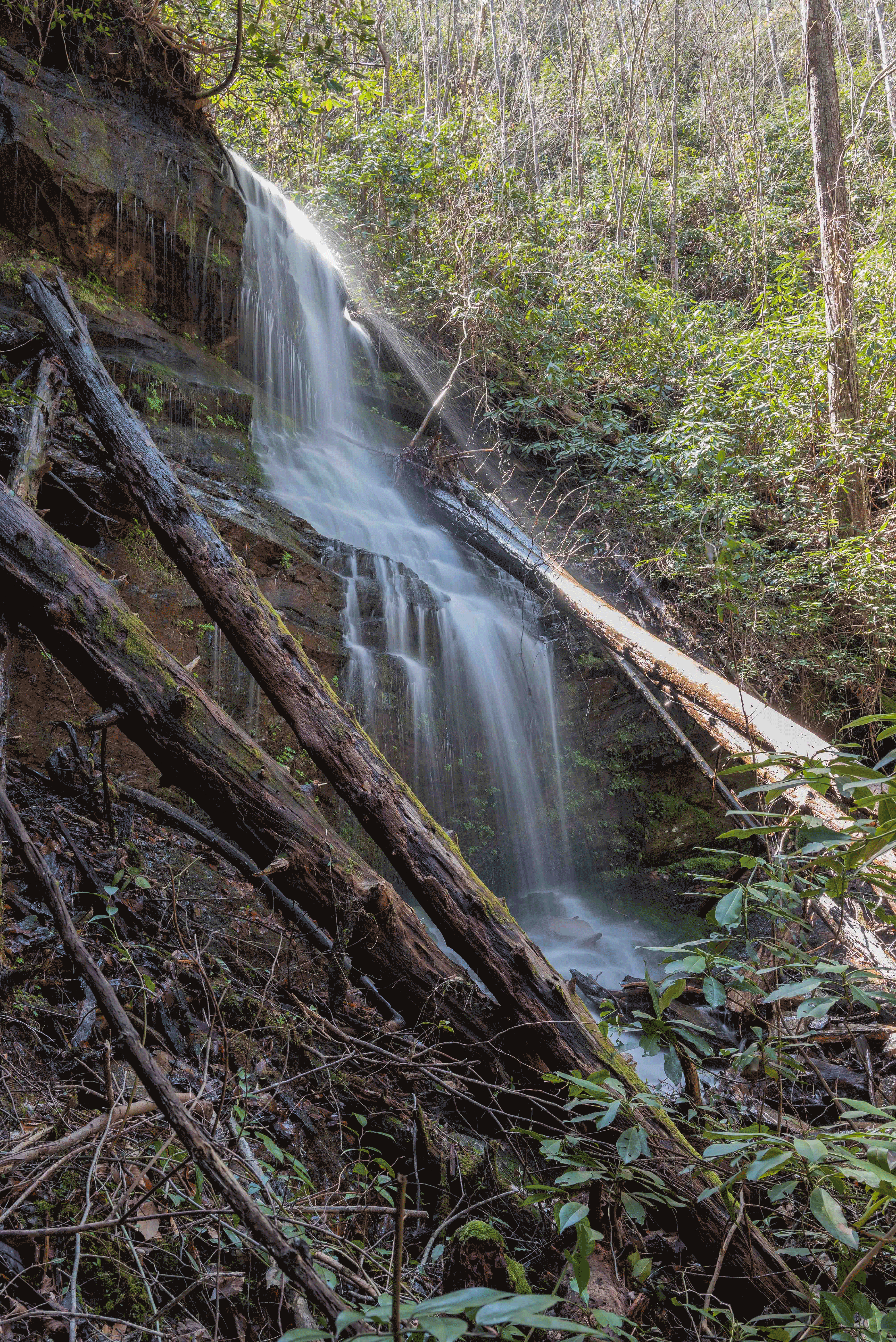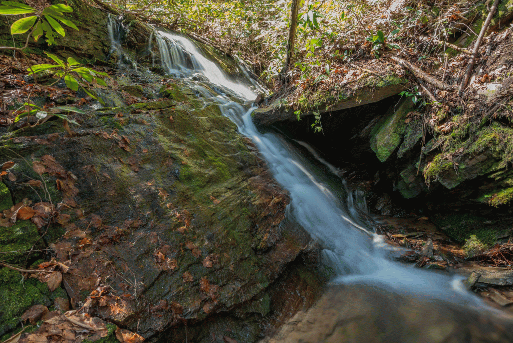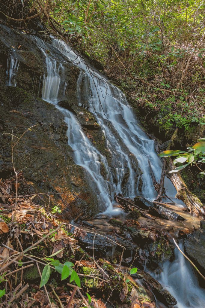 Crossing Opossum Creek is necessary to reach these falls. Using caution, and finding an area where the water isn’t too deep or too swift, this is not a problem. Your feet will get wet, even in lower water.