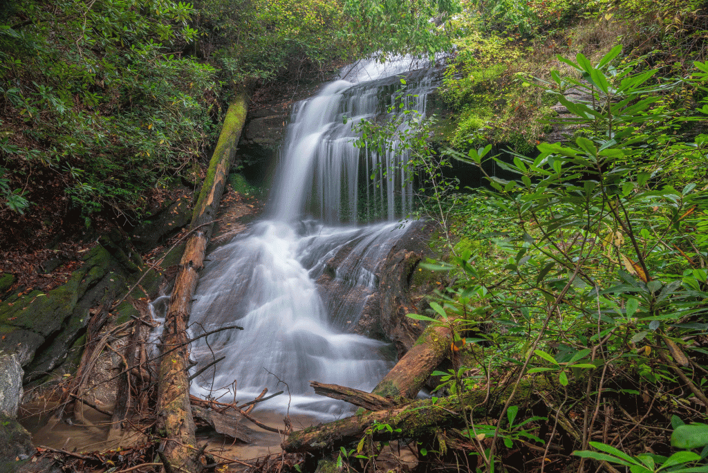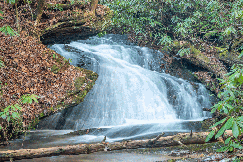 The uppermost falls, at 2160′, is small, but incredibly scenic with its unique rock formation. GPS 34.99574, -83.02830.