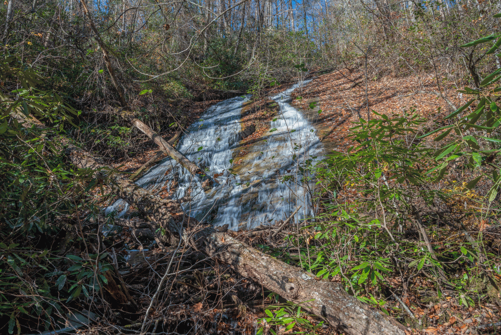 Around the 1870′ mark, this drop is closest to Highway 130. It’s a big one, probably 60-70 feet high. The lower portion is viewable from the base. GPS 34.99500, -83.02445.