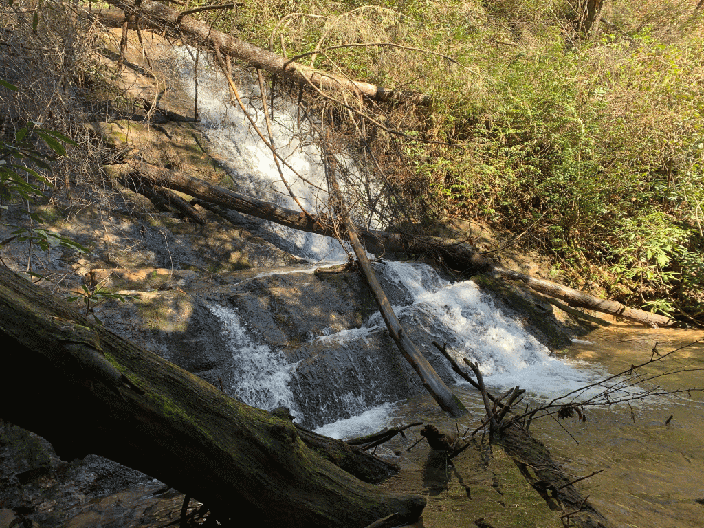 Upstream from Joney Woodall Falls sits this two-tiered waterfall where the stream makes a sharp left turn. The rock wall here is as impressive as the waterfall itself, towering high above the water. Unfortunately, there is some downfall on the falls, making decent photos nearly impossible. It is also not possible to see the entire drop from the base, but you can catch glimpses of it through the trees as you approach from downstream. These are cell phone shots, lower drop first, and then the uppermost drop: